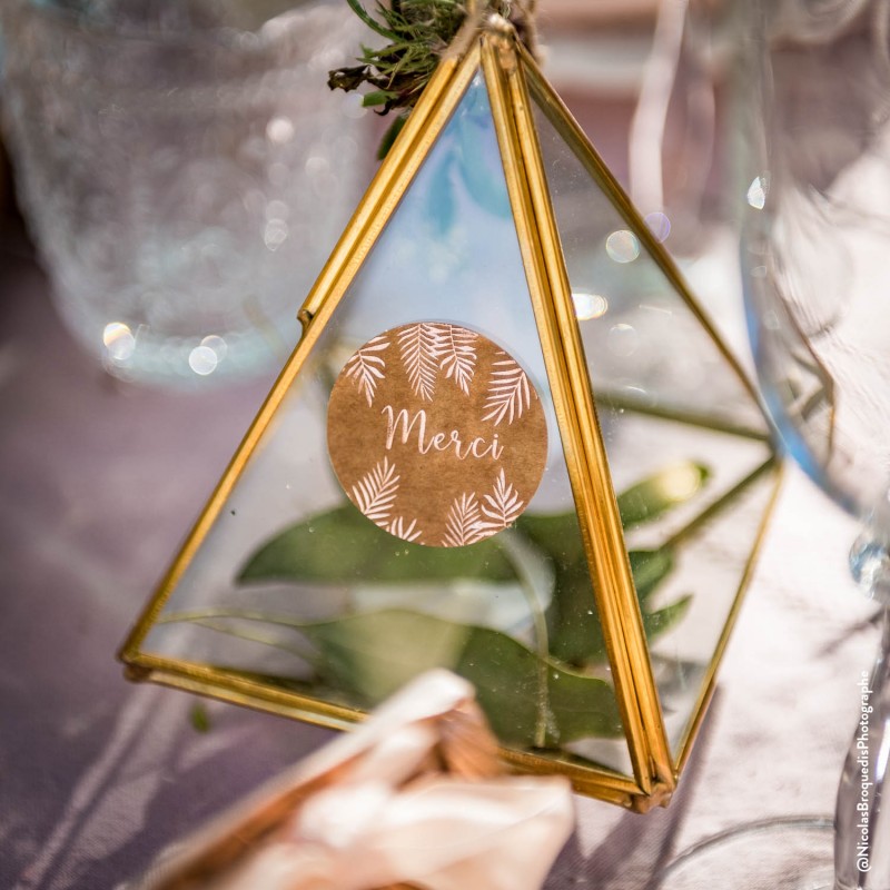 Dites "Merci" à vos invités avec ces stickers rose gold aux motifs fougères. Ces stickers "Merci" en kraft, pourront être coller sur un contenant dragées ou une boite dragées par exemple. Les stickers rose gold mesurent 4 cm de diamètre.